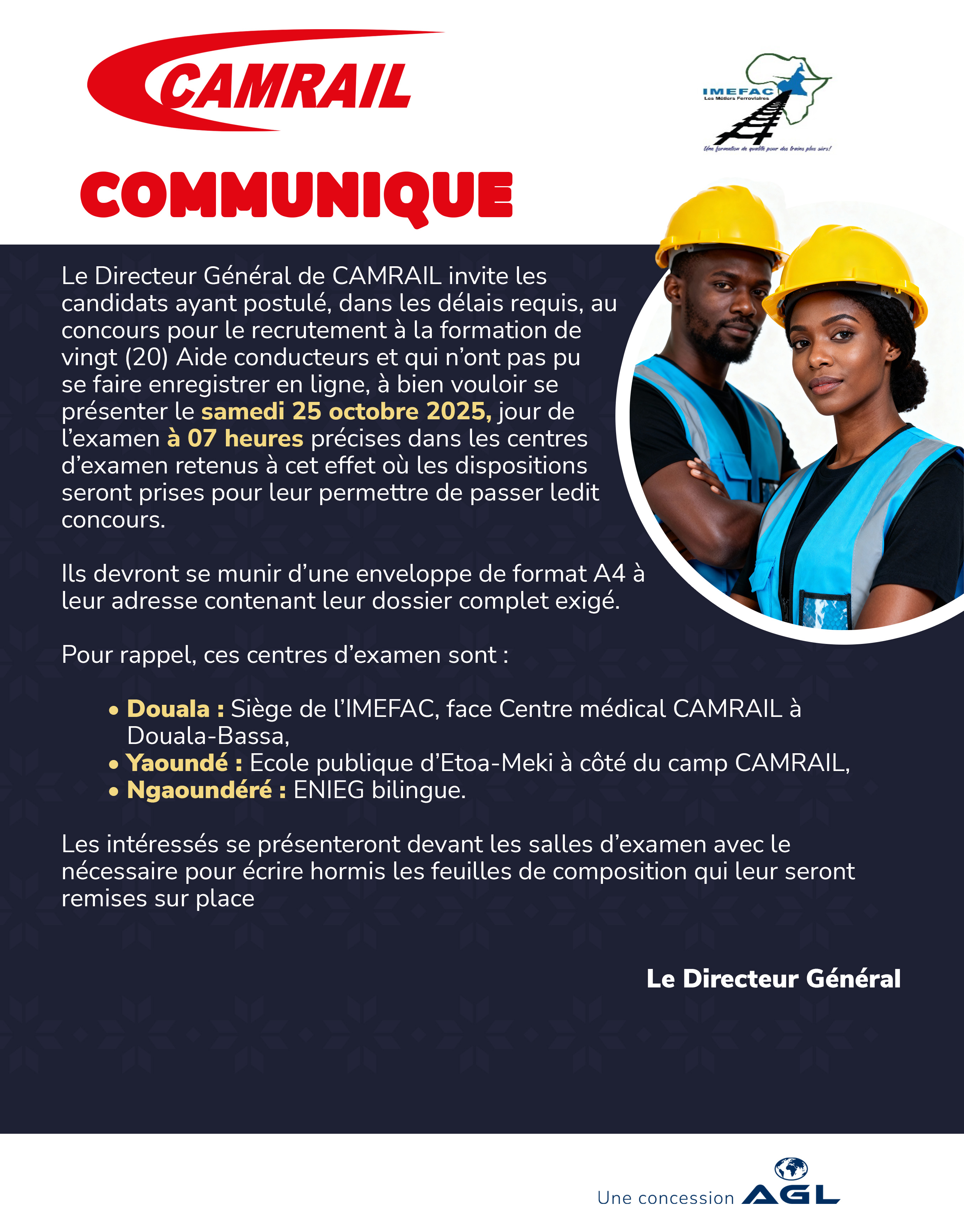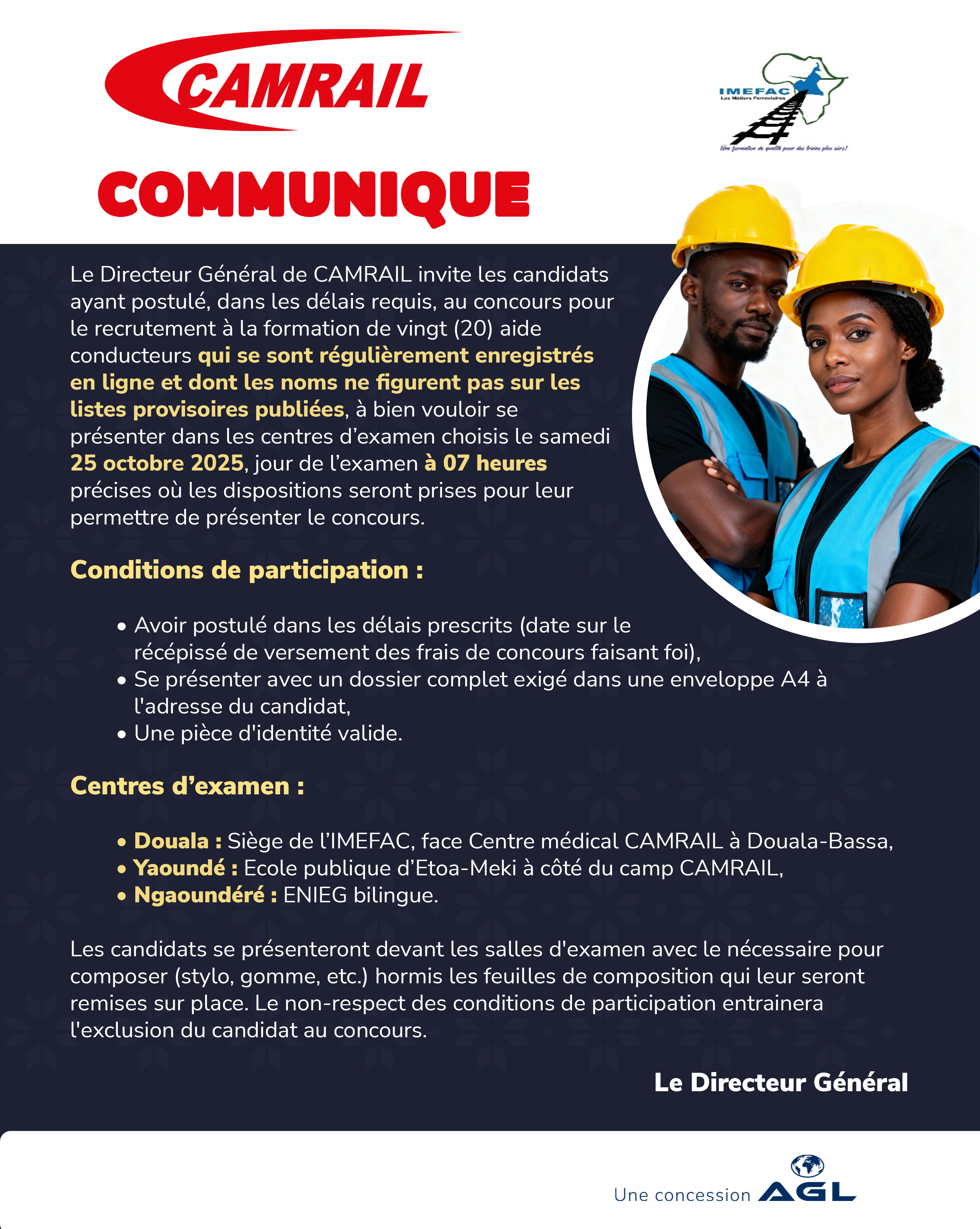 CAMRAIL, en partenariat avec l’IMEFAC – Institut de Formation Professionnelle aux Métiers Ferroviaires en Afrique Centrale, ouvre un concours de recrutement de 20 jeunes Camerounais pour la formation au métier d’Aide-Conducteur.